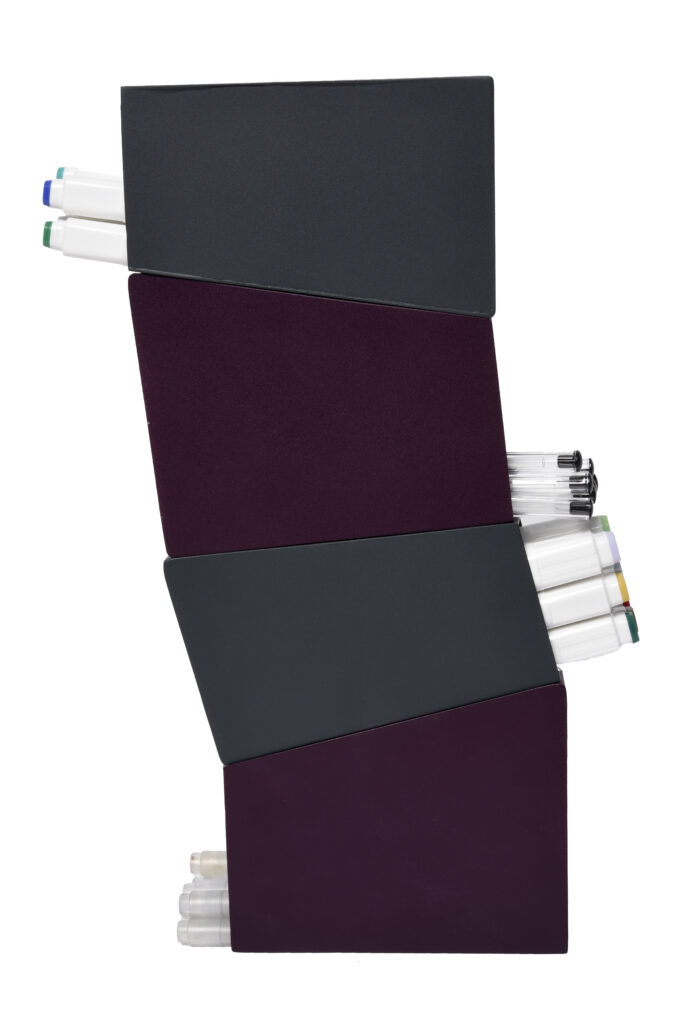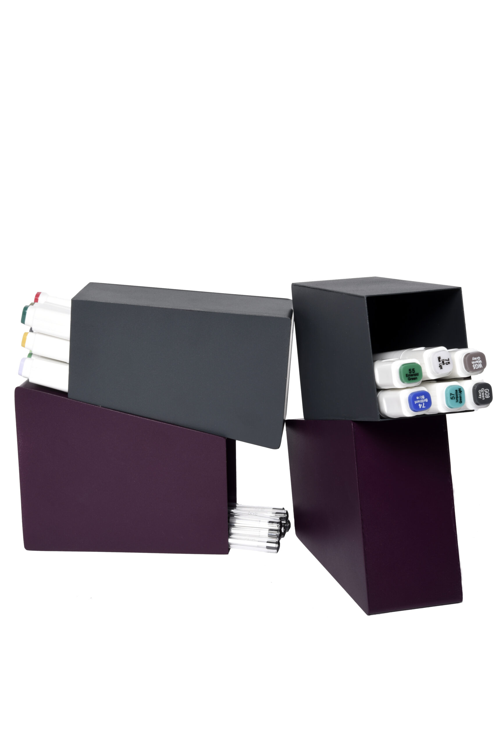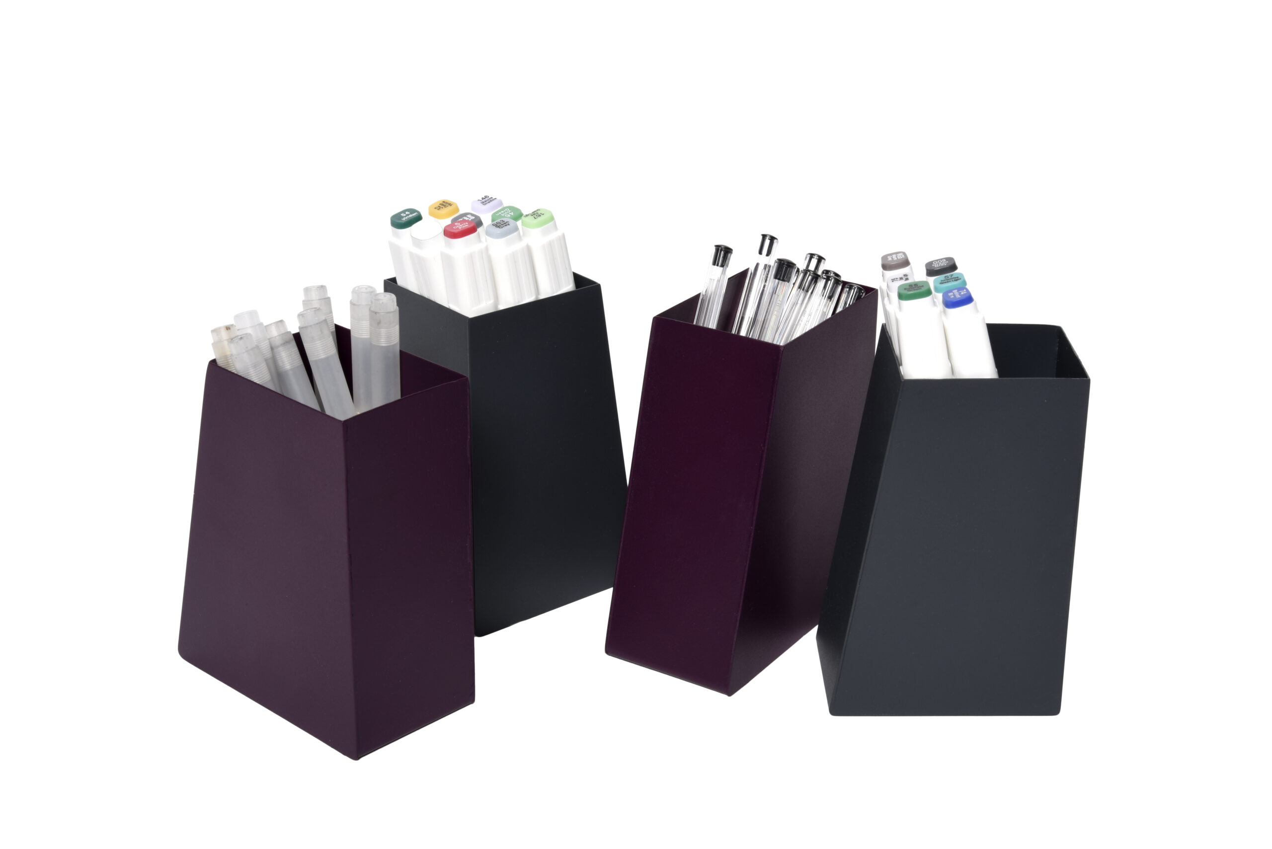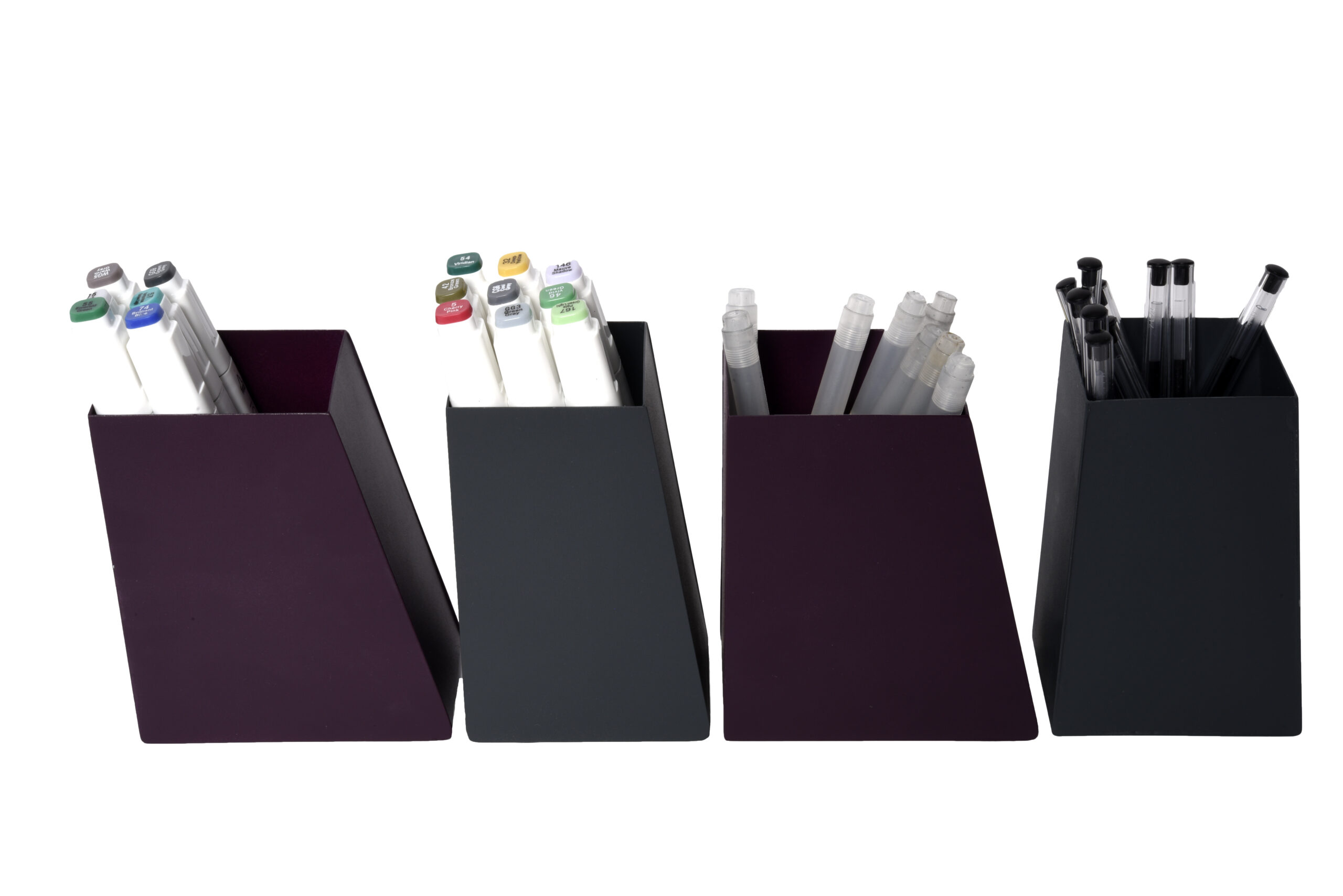 - Each container features a slight incline on one side, adding visual interest while facilitating easy access to stored pens from either the top or the side.